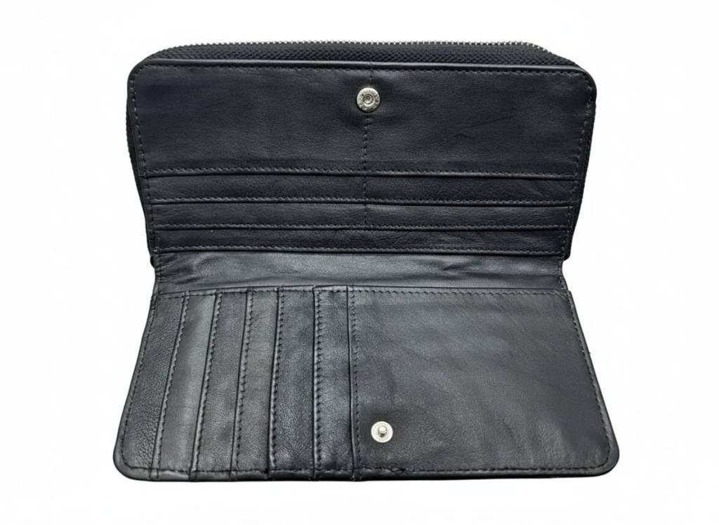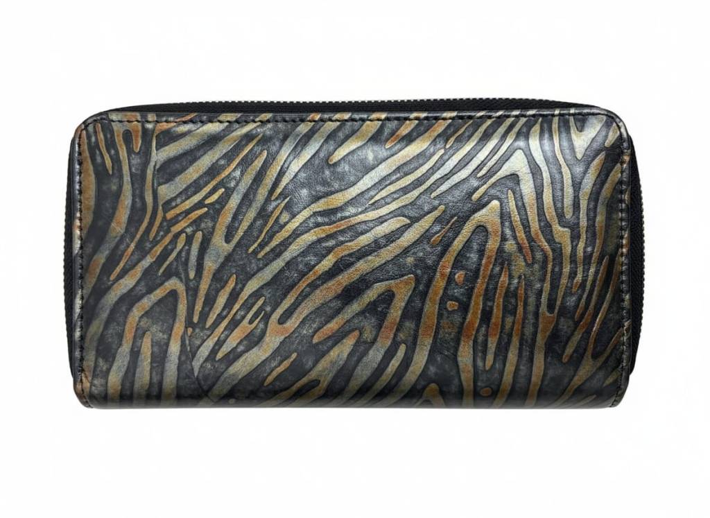 Billetera elaborada en cuero de Becerro, una billetera vanguardista con estilo y autenticidad, diseñada con un grabado de cebra y adorno de cadena en el frente. Cuenta con compartimientos para billetes y varias ranuras para tarjetas.