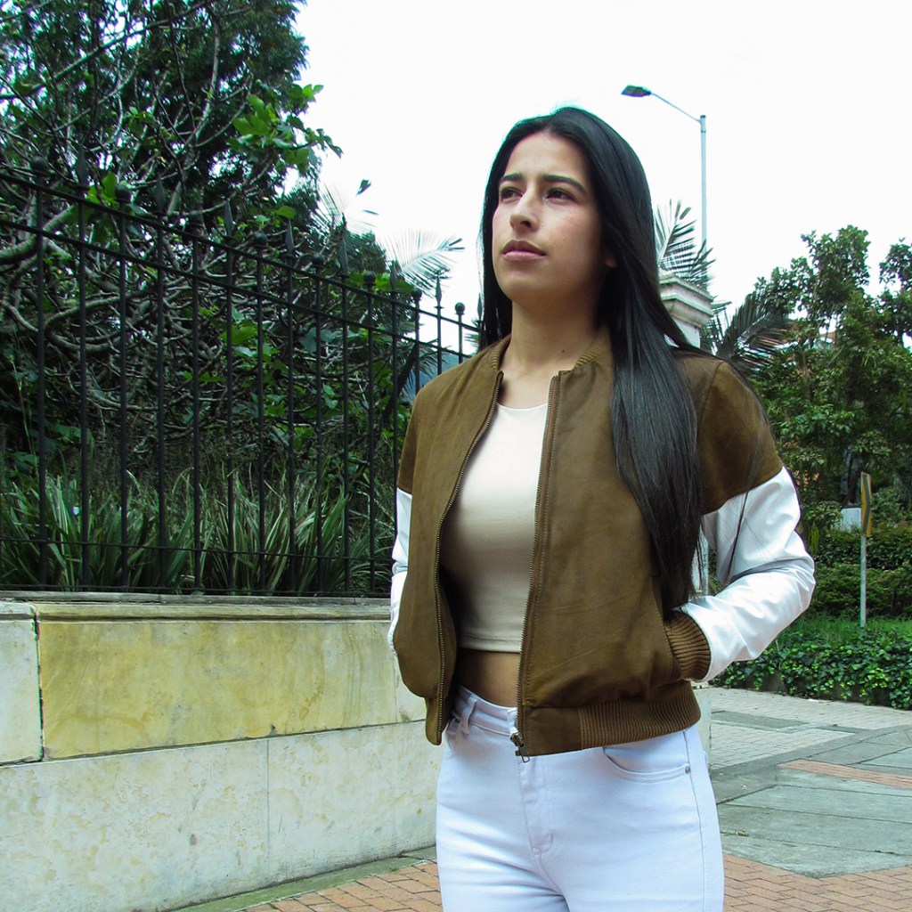 Diseñada con una silueta tipo bomber, mangas de cuero color blanco, cuello, puños y pretina en rib.