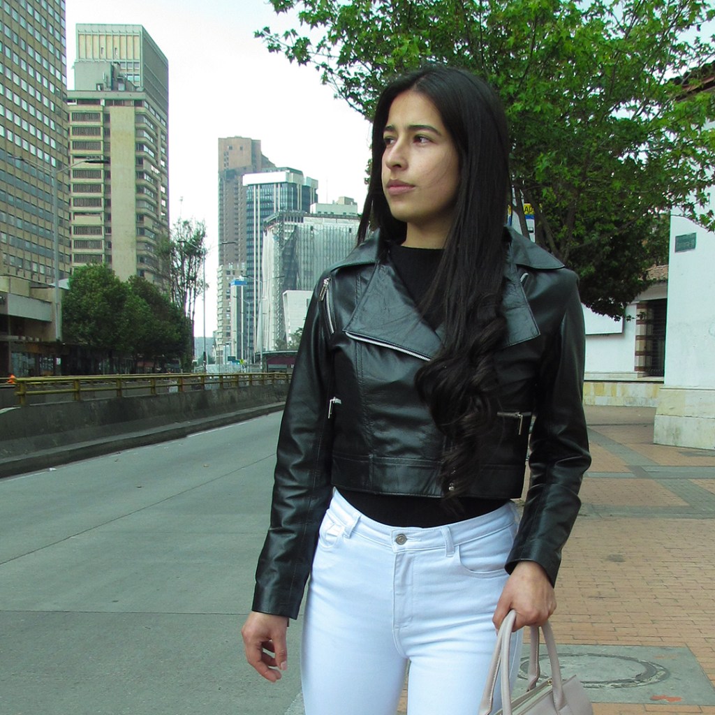 Diseñada con una silueta tipo biker, cuello de solapa, puños y bolsillo en torso con cremallera.
