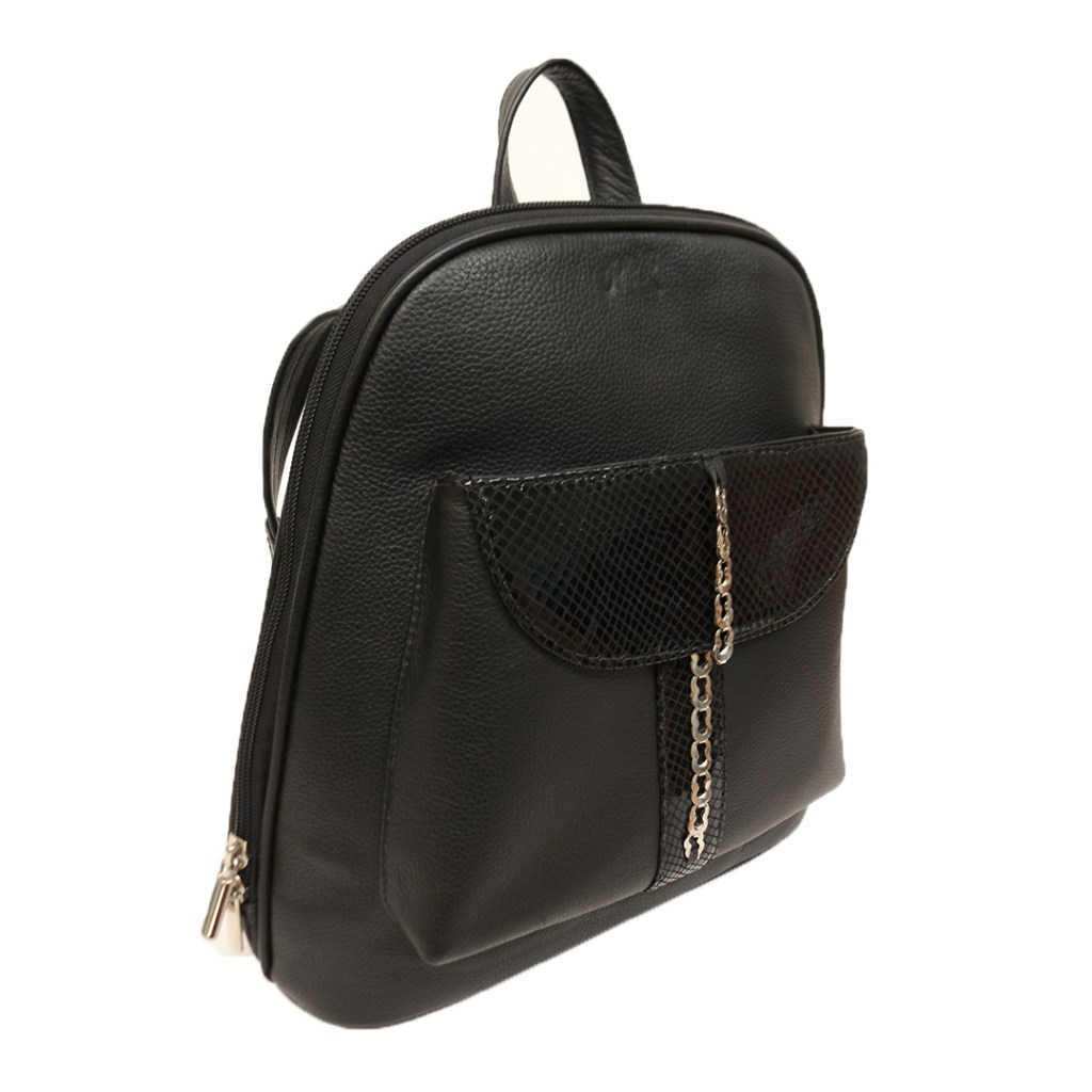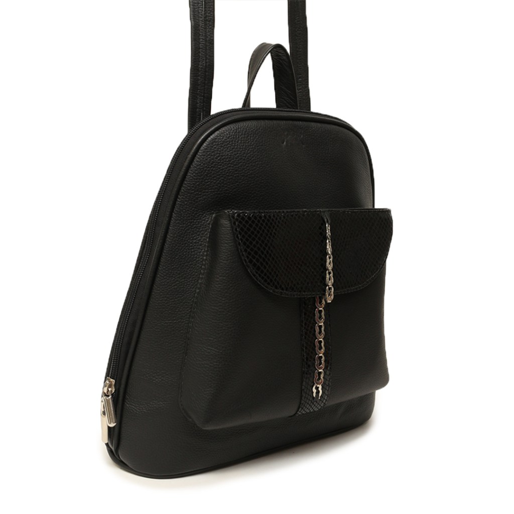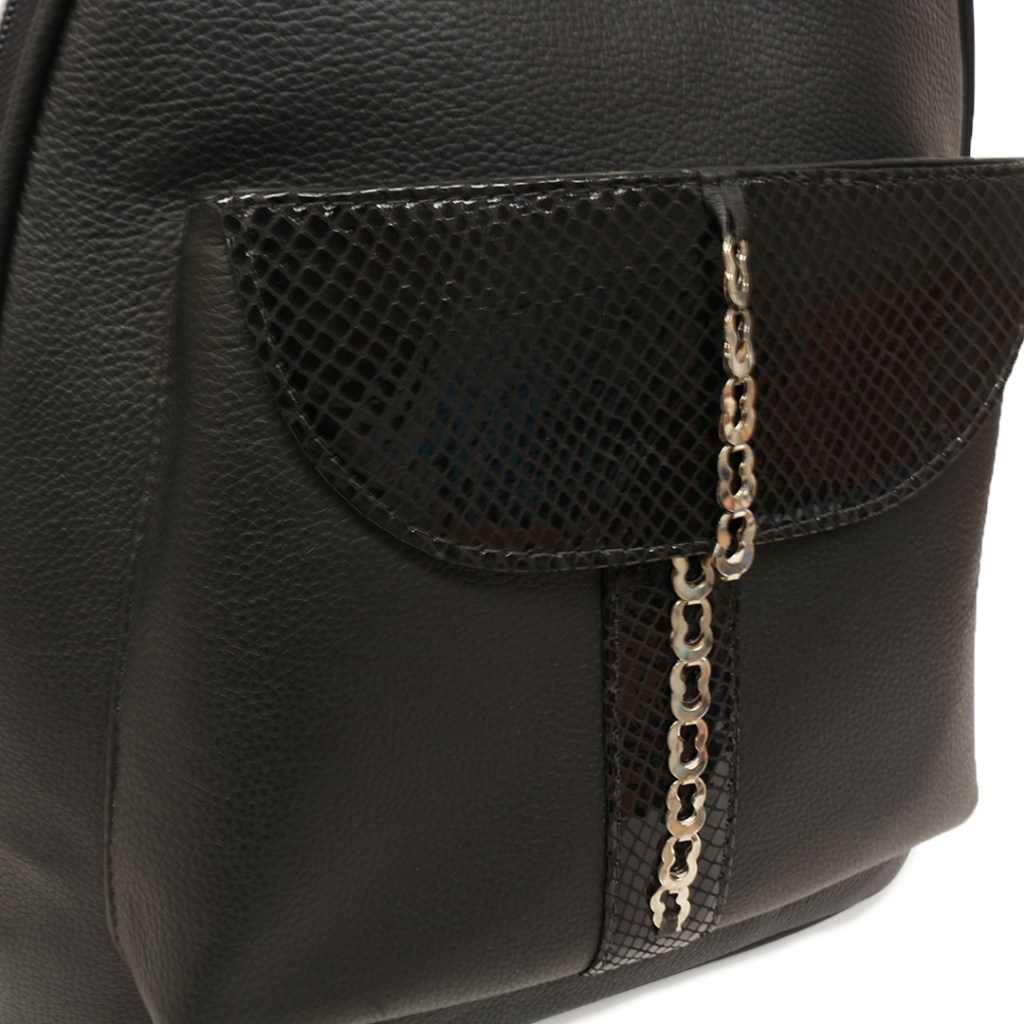 Su diseño en forma de morral compuesto de manija, tirantes, bolsillo frontal con tapa de cuero grabado y cadenilla, es una muestra de versatilidad y asombro.