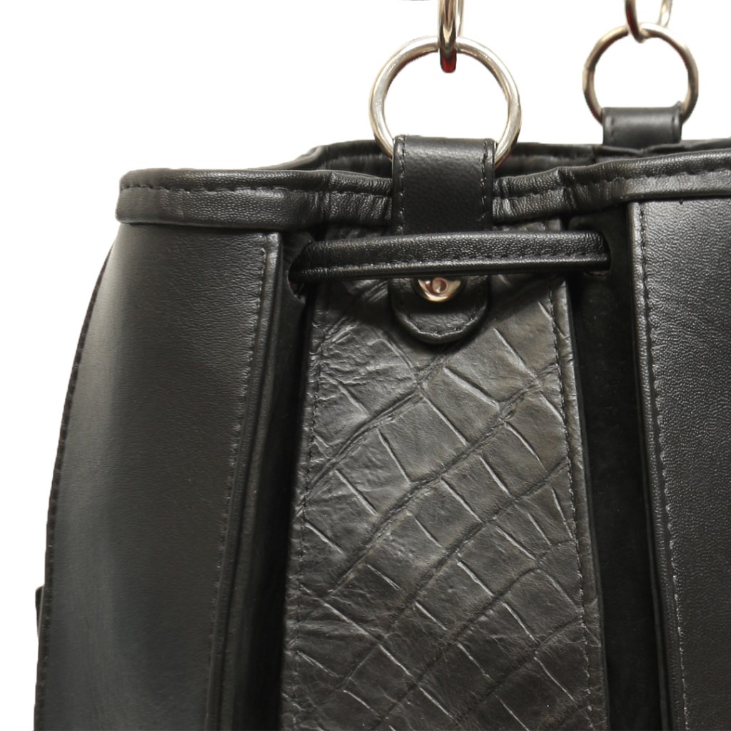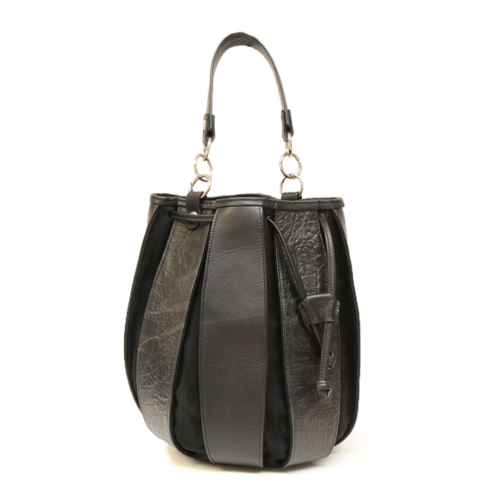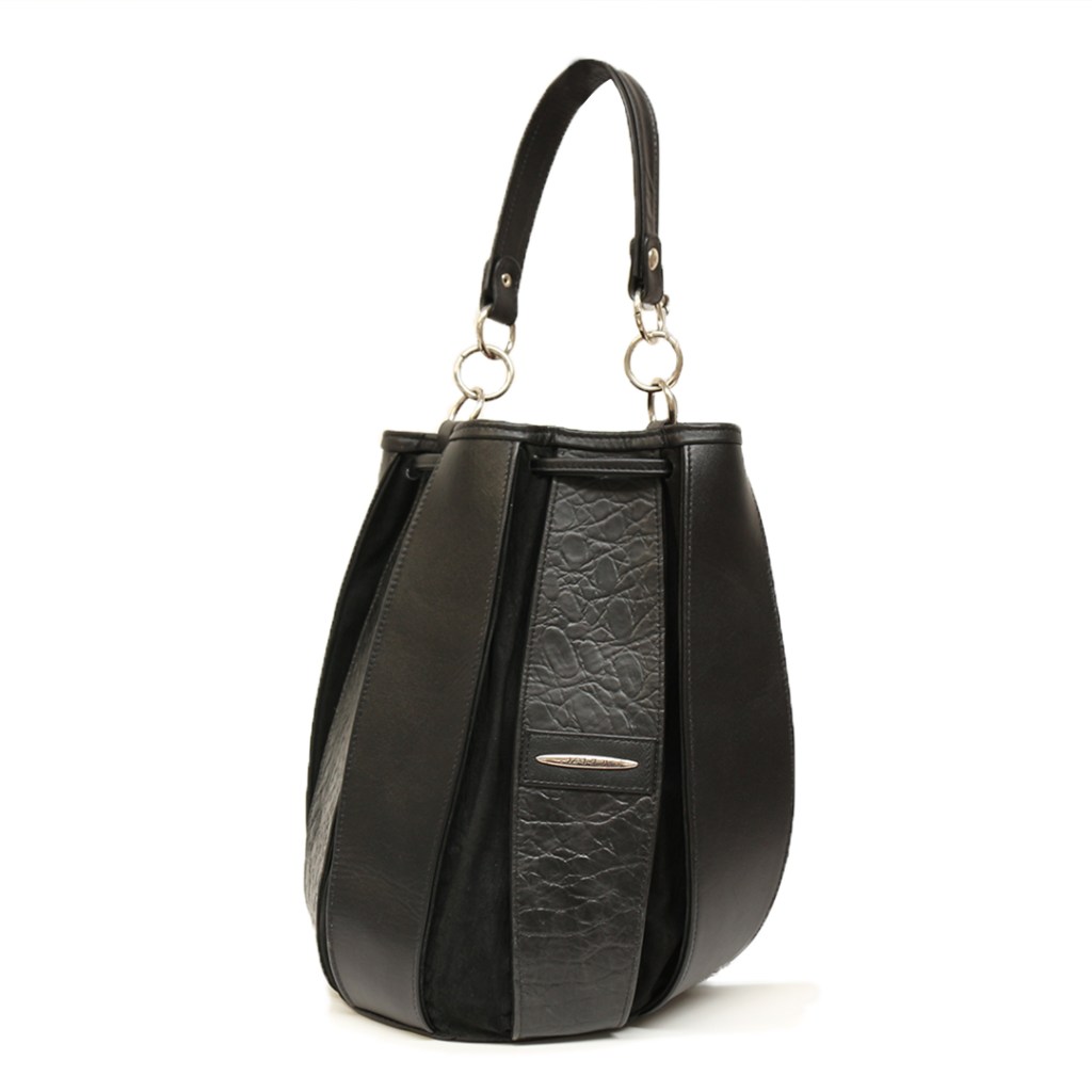 Su estilo y diseño en forma de mochila se componen de manija con herraje circular, tiras de cuero grabado y cuero liso.