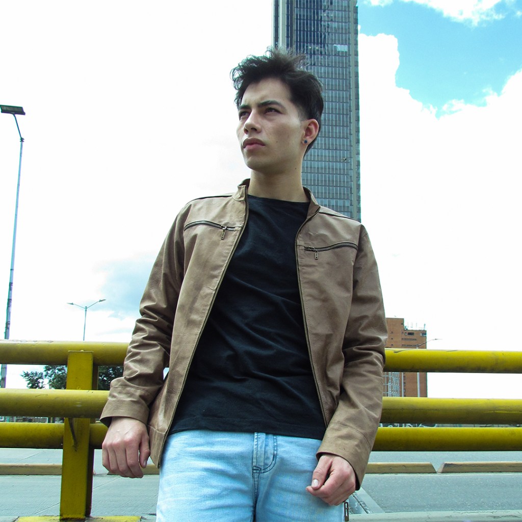 Chaqueta de cuero traslúcido color café manga blanca.$480.000