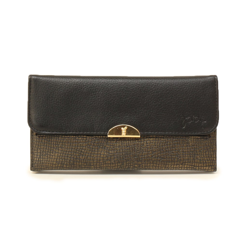 BILLETERA DE CUERO GRABADO CON BROCHE COLOR NEGRO Y DORADO.