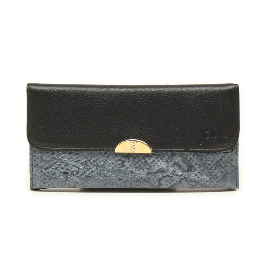 BILLETERA DE CUERO GRABADO CON BROCHE COLOR NEGRO Y AZUL.